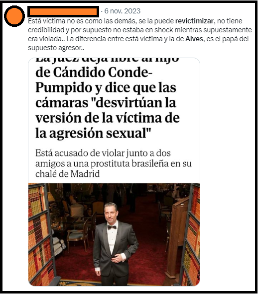 - Todo lo demás es la declaración de la víctima (que se contradice en cosas como si se besaron o no y en su actitud fuera de la sala) y de miembros destacados de la Industria Viogen: forenses, psicólogas (en el juicio) y representantes de asociaciones viogen (estas últimas en Twitter).