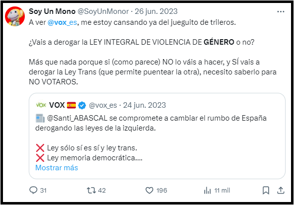 - ❌ Junio 2023: VOX: Sorprendentemente a medida que se acercan las elecciones se manifiesta A FAVOR de mantener la ley viogen y en su listado de leyes a derogar no la incluyen, la comunidad del viogen se manifiesta indignada en Twitter.