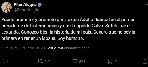 28/11/2024. Pilar Alegría puede prometer y promete que ... no sabe quien fue el primer presidente de la democracia