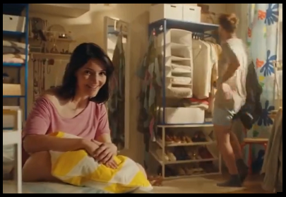 Anuncio misándrico de IKEA en TV, el hombre se presenta despeinado, desvistiéndose con movimientos torpes en segundo plano de espaldas y se le critica deshumanizándole [2]