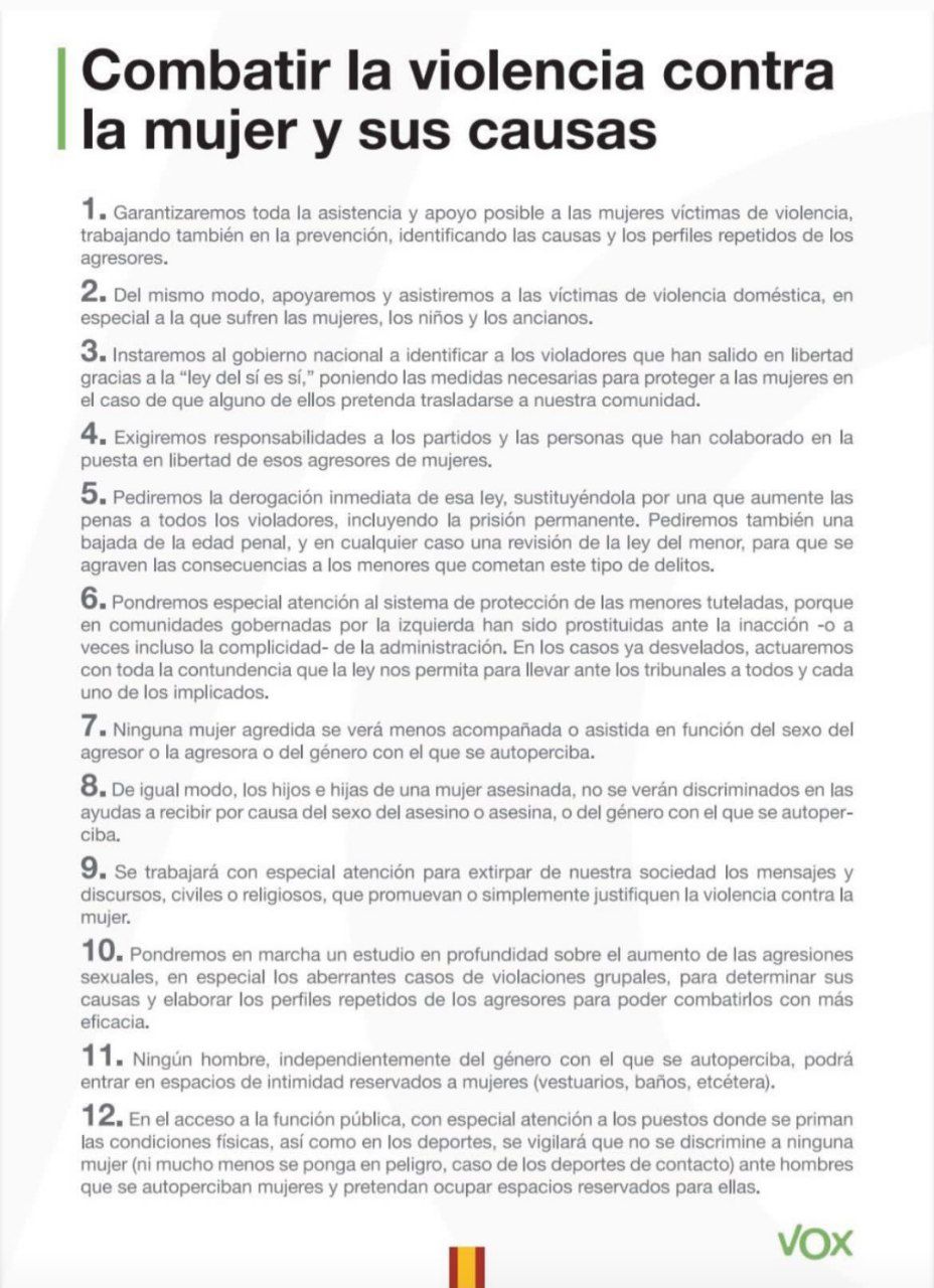 Pide la derogación de la ley "solo sí es sí" pero no menciona en ningún sitio la ley de violencia de genero o el clientelismo político de la misma que sí había atacado antes (y volvería a hacer después de las elecciones) en numerosas ocasiones.
