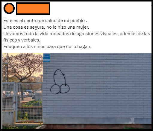 | En una foto se ve un pene dibujado en la fachada Este es el centro de salud de mi pueblo. Una cosa es segura, no lo hizo una mujer. Llevamos toda la vida rodeadas de agresiones visuales, además de las físicas y verbales. Eduquen a los niños para que no lo hagan. [9] | El término "violencia visual" podría entrar perfectamente en los neologismos que el feminismo clientelar inventa a diario, penes los dibujan y difunden hombres y mujeres continuamente (en despedidas de soltero o decoración sexual). |