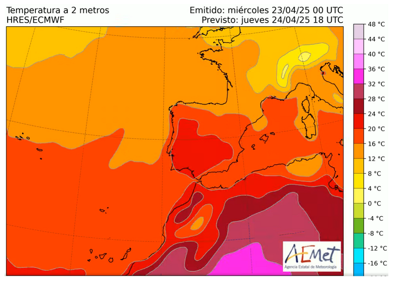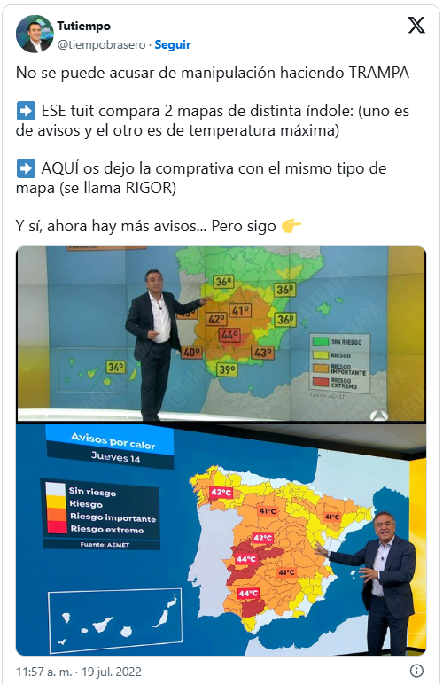 - RTVE dice que la crítica es que AEMET manipula los colores y RTVE informa que eso es un bulo, cuando la crítica no es sobre los informes de AEMET (en su web) sino de lo que la televisión hace de cara al público donde claramente se usa una paleta entre rojo y morado incluso cuando hay 30 grados. Por cierto los informes de AEMET tampoco son consistentes en la escala de colores de por sí