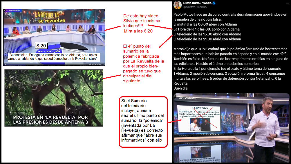 | RTVE usó los programas matinales para dar eco a la acusación de La Revuelta de mala praxis por parte del Hormiguero (era realmente una clausula de exclusividad firmada por el equipo del motorista) | Silvia Intxaurrondo apela a una noticia de ElMundo que sale de Fondo en el alegato de Pablo Motos que ADEMÁS es cierta | Silvia Intxaurrondo hace un triple mortal apelando a "dar la información con su propia cara" para intentar ocultar los hechos que están a un video de distancia | [12] |